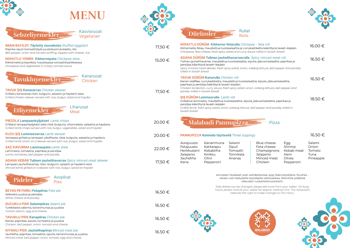 Tervetuloa makumatkalle turkkilaiseen ruokamaailmaan Ravintola Malabadiin! Keittiöstämme huokuu aito turkkilainen tunnelma: grillin liekki, laadukkaat raaka-aineet, mausteiden aromikkaat tuoksut sekä intohimomme ruoan valmistamiseen. Käytämme terveellisiä, aina tuoreita raaka-aineita kuten kasviksia, kalaa, lihaa, maitotuotteita ja hedelmiä. Meillä ruoanlaittoa rakastetaan. Malabadin turkkilainen keittiö on jatkuvassa luovan kehityksen tilassa, ikivanhoja perinteitä koskaan unohtamatta.